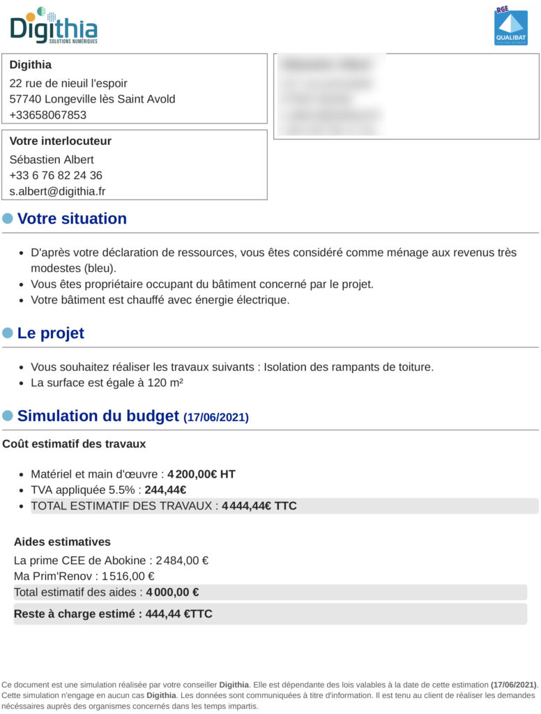 Notre système génère un document PDF à l’image de votre entreprise, avec les coordonnées du contact commercial et bien entendu l’ensemble des calculs des aides possibles.